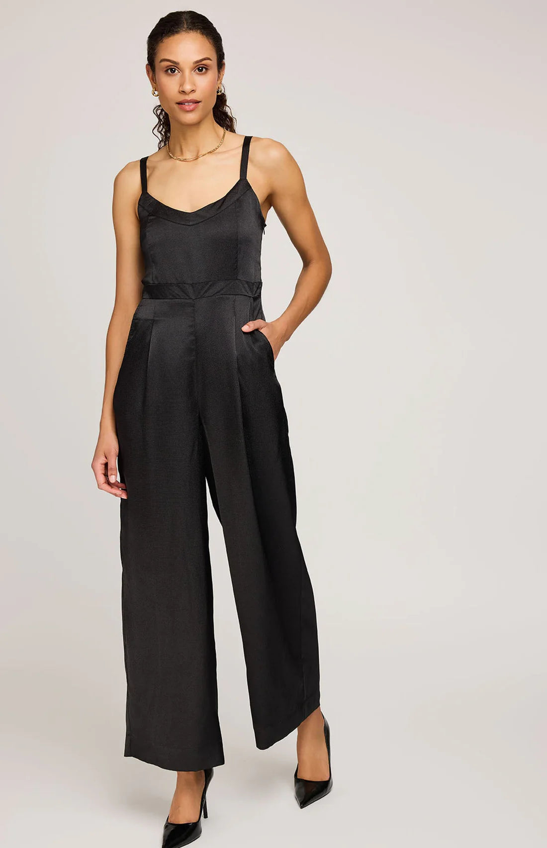 The Irina jumpsuit is made of a textured satin fabric. Features include adjustable straps, pockets, and a back smocking panel.